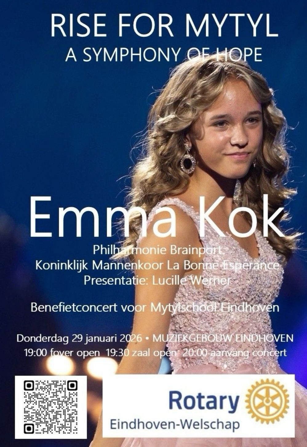 Rotaryclub Eindhoven-Welschap organiseert op donderdag 29 januari 2026 het benefietconcert “Rise for Mytyl – A Symphony of Hope” in het Muziekgebouw Eindhoven.