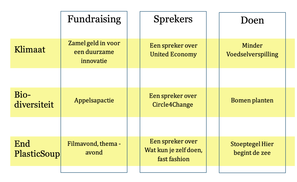 Ben je op zoek naar inspiratie voor je club? Brainstorm dan eens over onderstaande matrix. In de matrix zijn voorbeelden gegeven van de combinaties, maar er is nog heel veel meer mogelijk.