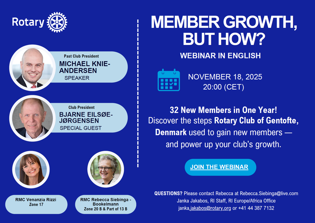 Je kunt je hiervoor per e-mail registreren bij  de Regional Membership Coordinator rasmus.egeskjold@rotary.org