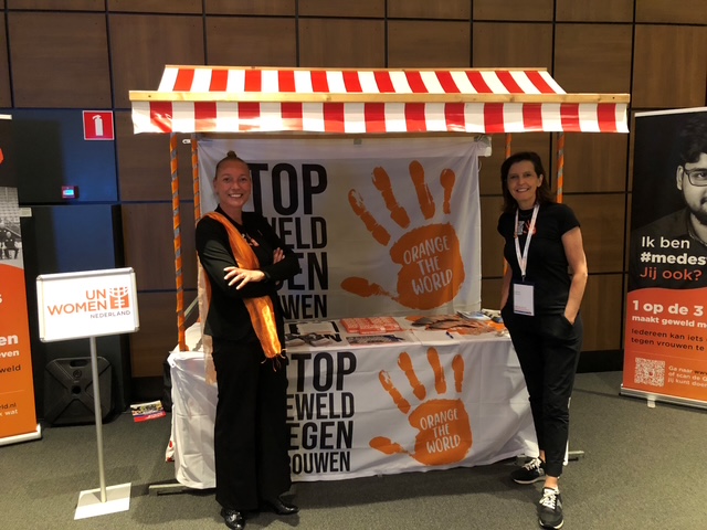 Het jaarlijkse tegengeluid in de vorm van de campagne Orange the World in november zorgt voor een oranje gloed – wereldwijd. Gebouwen lichten oranje op, overheden, bedrijven en organisaties hijsen oranje vlaggen. ‘In ons land doet 80 procent van de gemeenten mee. Soms door symbolisch gebouwen oranje te verlichten als teken van solidariteit, maar ook door inhoudelijk aandacht te besteden aan geweld tegen vrouwen middels bijeenkomsten en debatten.’