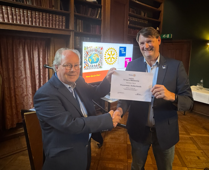 Tijdens het clubbezoek op 20 november overhandigde onze Gouverneur, Hans Lodder, het officiële jubileumcertificaat en een hartelijke felicitatiebrief van de internationale president van Rotary aan voorzitter Robert van Lit.