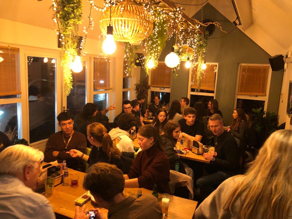 Een deel van de RGO interacters met de Youth Exchange en aantal Rotary leden (bij Croissy avond voor Santarun)