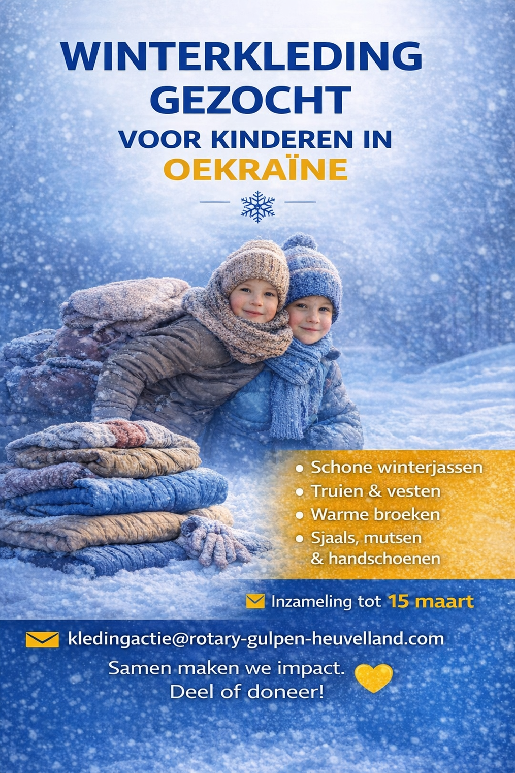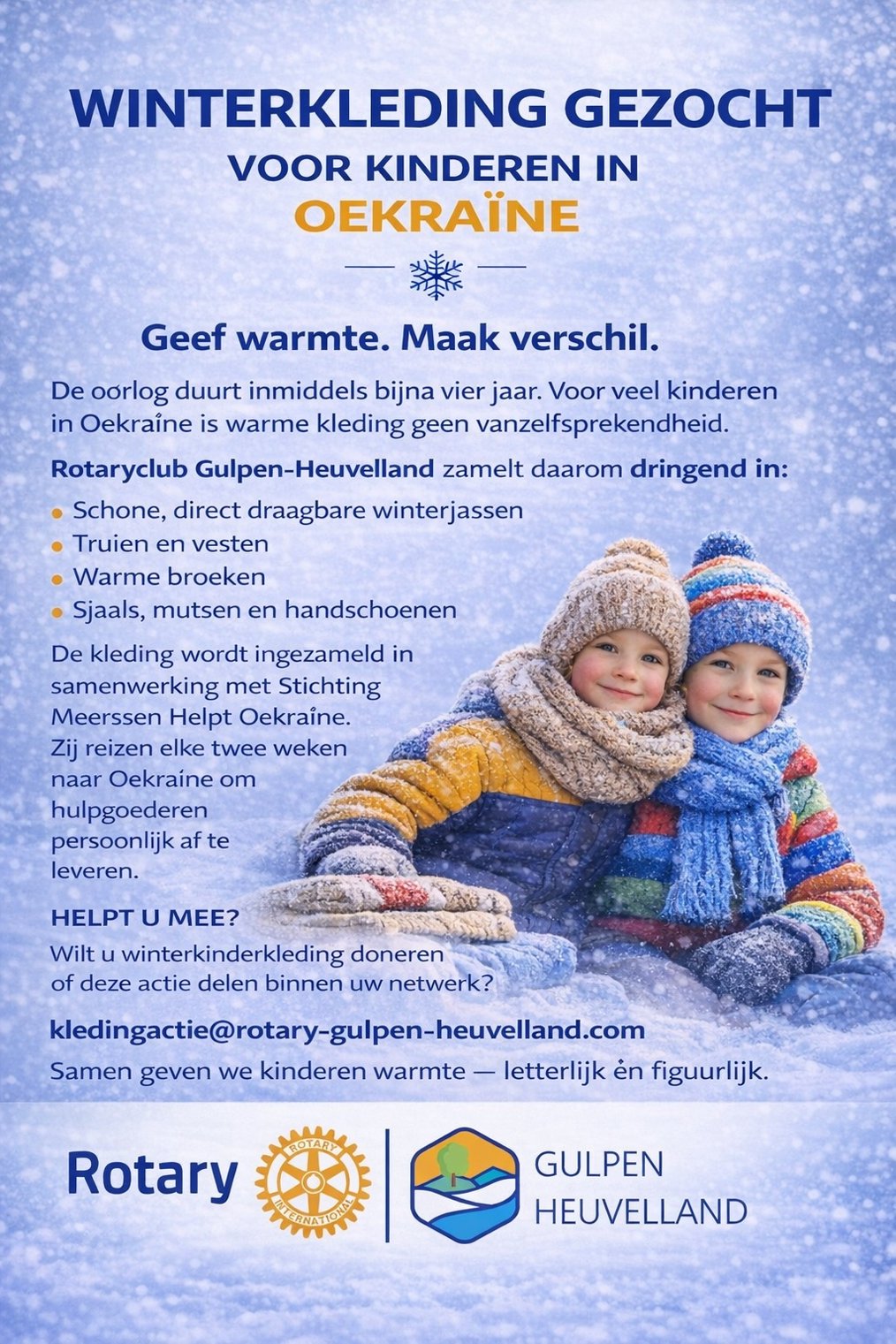 Daarom start Rotary Gulpen Heuvelland een gerichte kledingactie. De club zamelt dringend schone, direct draagbare winterkinderkleding in voor jonge oorlogsslachtoffers in Oekraïne.