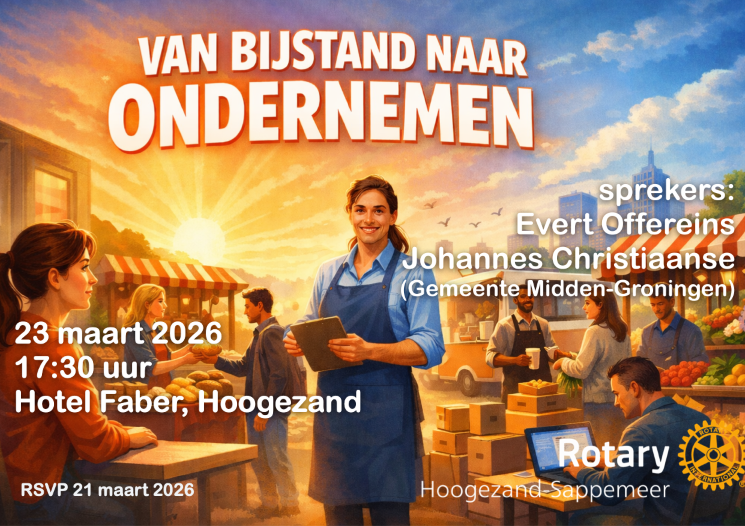 23 maart 2026: Kennismaking met Rotary. Sprekers Evert Offereins en Johannes Christiaanse. Onderwerp: van bijstand naar ondernemen. Aanmelden vóór 21 maart via 06-22503633 of huubvanhaelen@gmail.com.