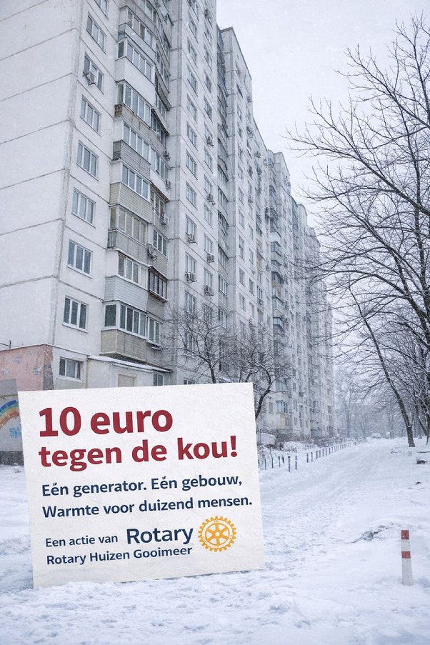 Rotary Huizen Gooimeer heeft in februari en maart €14.141 ingezameld voor de aanschaf van een generator voor een zestien verdiepingen tellend flatgebouw in Kyiv. Dankzij deze voorziening hebben ruim duizend bewoners weer toegang tot verwarming en stromend water tijdens langdurige stroomuitval.