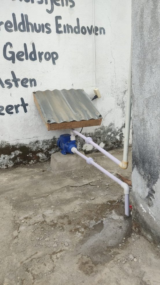 We hadden zelfs nog geld over om een pomp te plaatsen. Dikwijls is de druk in de waterleiding te laag om in onze ton op hoogte te kunnen stromen. Onze kinderen en leerkrachten hoeven niet meer met emmers de toiletten door te spoelen. We hebben nu 24 uur per dag stromend water in onze toiletten en daar zijn we Jumbo Heerschap en Rotaryclub Leudal ongelofelijk dankbaar voor.