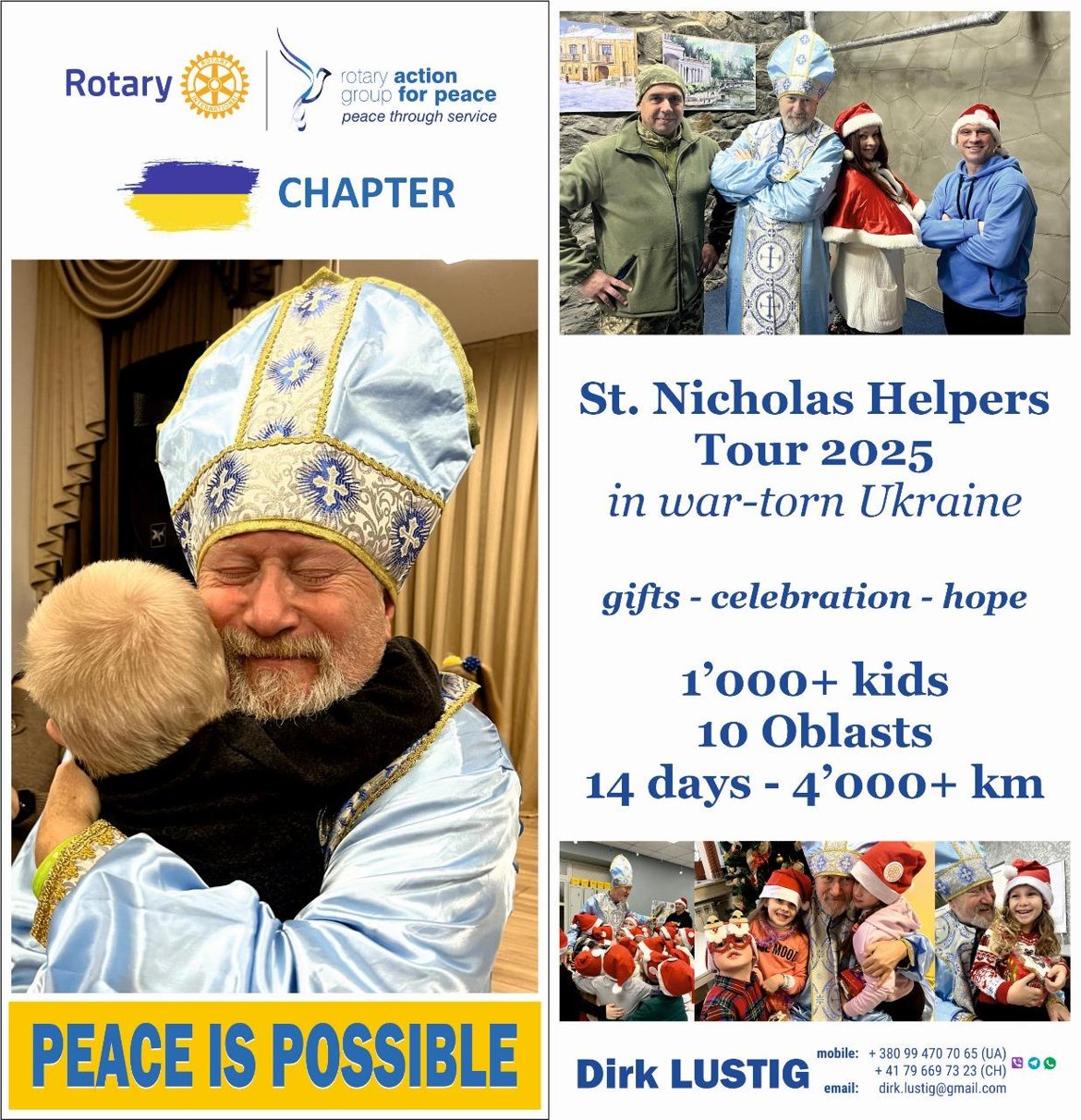 In een tijd waarin oorlog en onzekerheid het dagelijks leven in Oekraïne bepalen, blijft één man een bron van licht en menselijkheid: Dirk Lustig, een Zwitserse oorlogscorrespondent, Rotarian en inwoner van de regio rond Kiev. Al meerdere jaren bezoekt hij, verkleed als Sinterklaas, kinderen die leven vlak achter de gevechtslinies. Kinderen die vaak hun gevoel van veiligheid en kind-zijn zijn kwijtgeraakt.