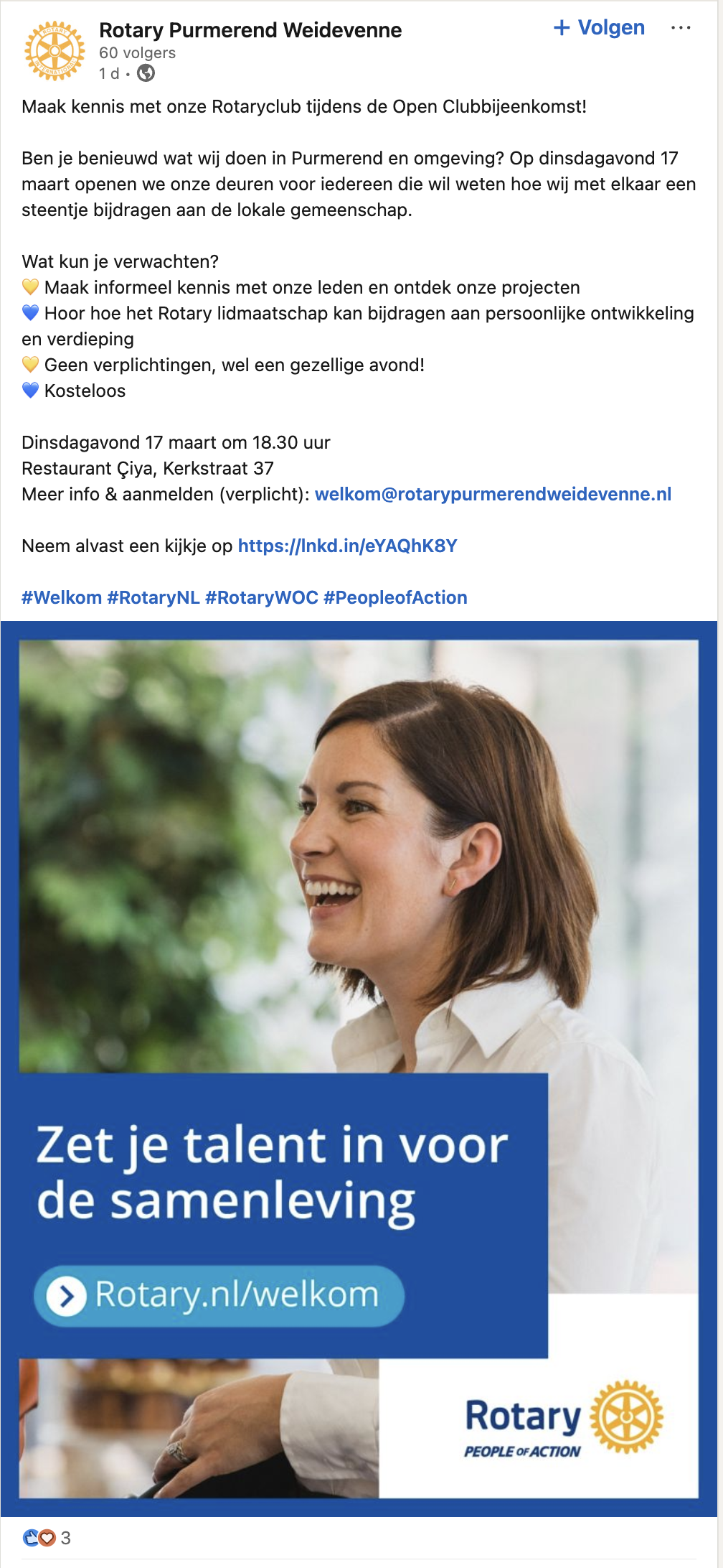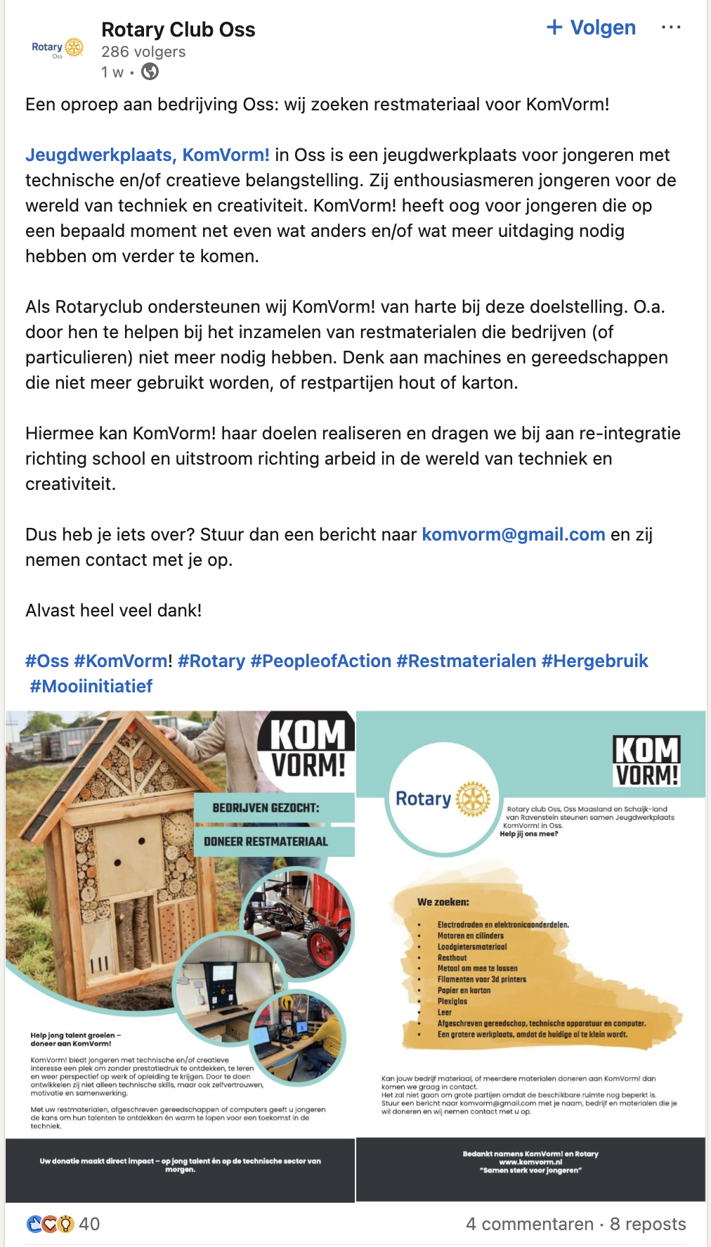 Een duidelijke oproep van Rotaryclub Oss met een flyer als beeld voor nog meer informatie. Het bericht is actief gerepost wat bijdraagt aan nog meer zichtbaarheid op LinkedIn. Afsluitend is er een duidelijke call to action gebruikt. Er zijn iets meer dan de voor LinkedIn meest gewenste (5 stuks) hashtags gebruikt.