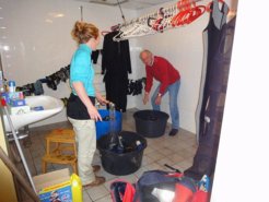 Ongeveer 30 kano’s van verschillende grootte schoonspuiten (hoge druk spuit) en daarna met schoonmaakmiddel goed schoonmaken en oppoetsen. Ze glommen weer! Opstapelen op een grasveld. Surfplanken volgden op de stapel. Alle stoelen kregen nieuwe dopjes onder de poten, een grote container werd uit het water getakeld. Dat laatste alleen al, gaf een mooi beeld van de leiderschapskwaliteiten binnen Rotary. En het lukte na een uur. Het terrein moest opgeruimd worden. Surfpakken uitspoelen en te drogen hangen. Zwemvesten nakijken, uitspoelen en te drogen hangen Zeilpakken nakijken, wassen, te drogen hangen. Pieter ging er vol voor. Bergkisten uit de haven leegmaken, schoonmaken en achter het huis bergen. Zeilboten schoonmaken en behandelen tegen schimmel, een klusje waar Cordula zich volledig op gestort heeft.
