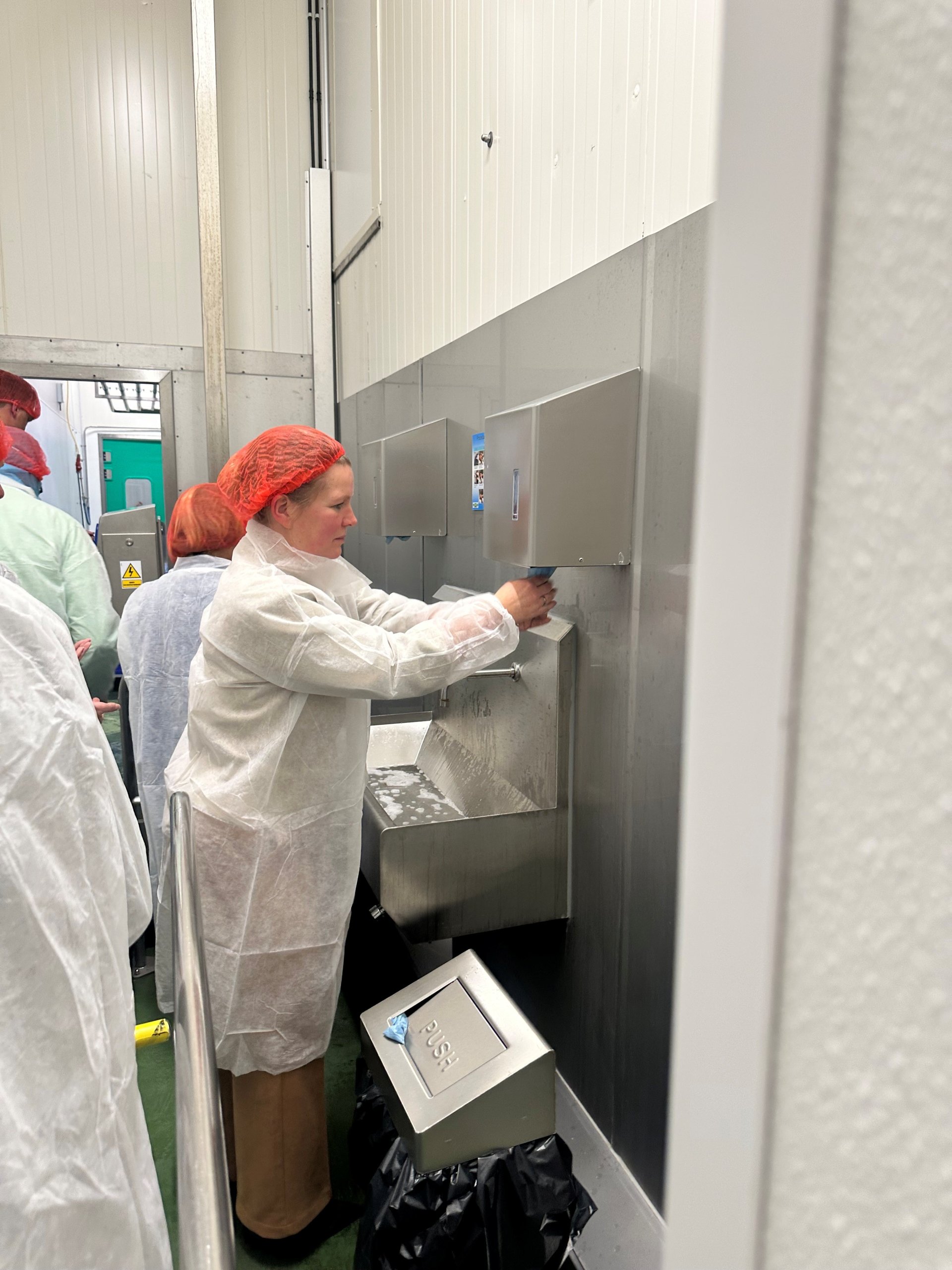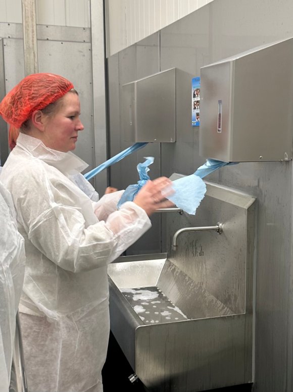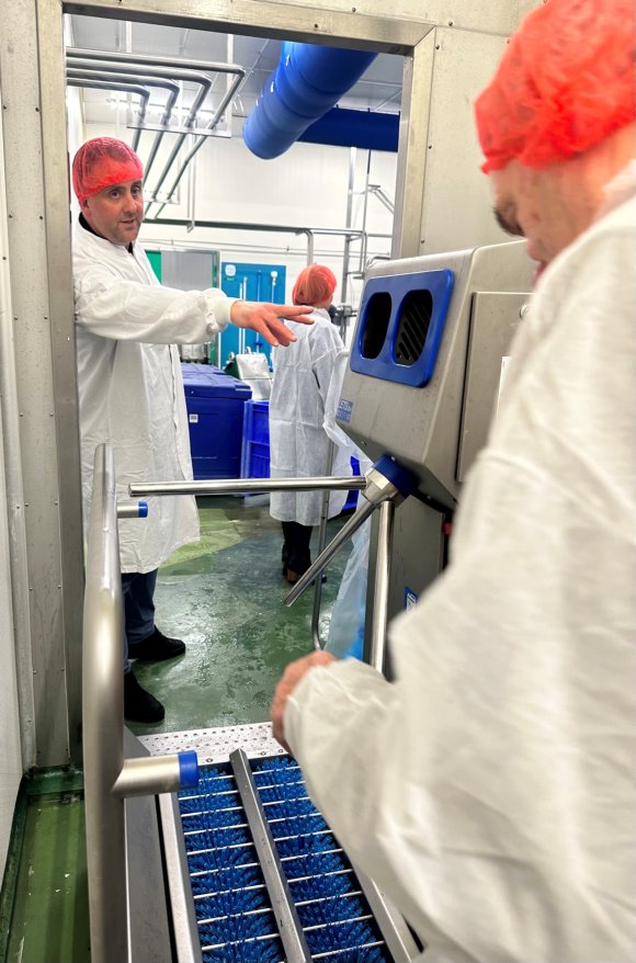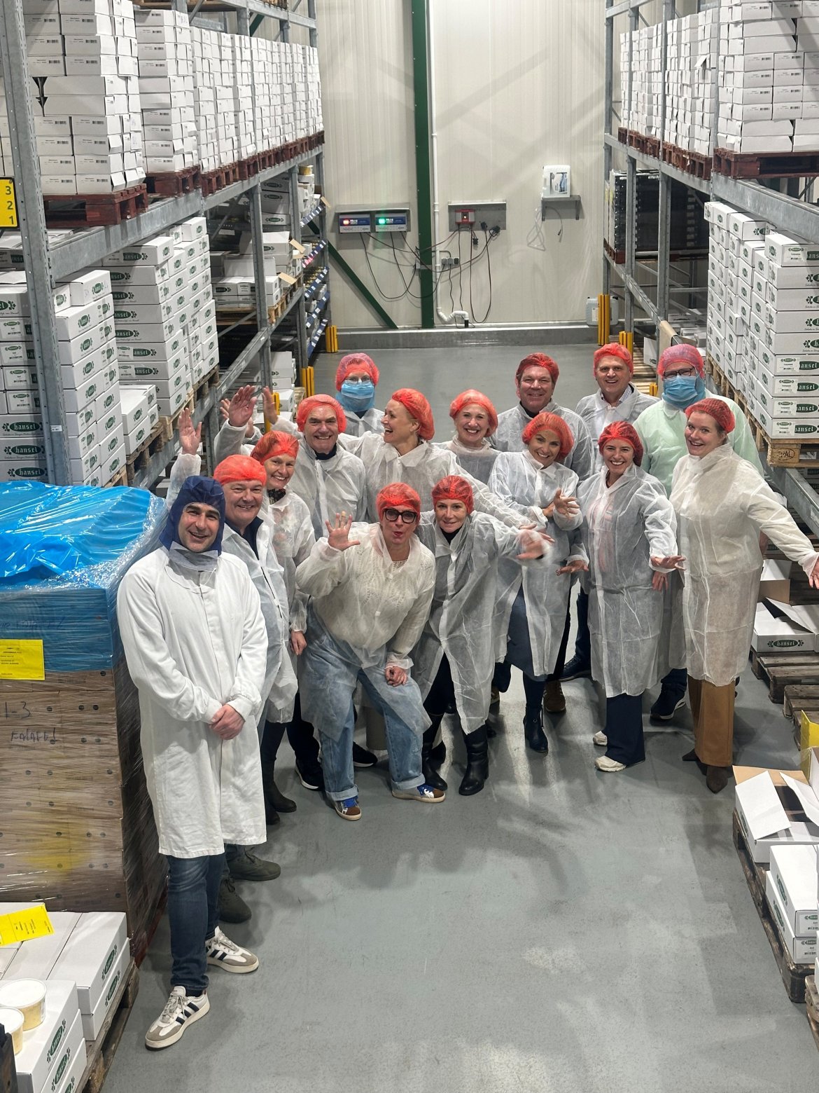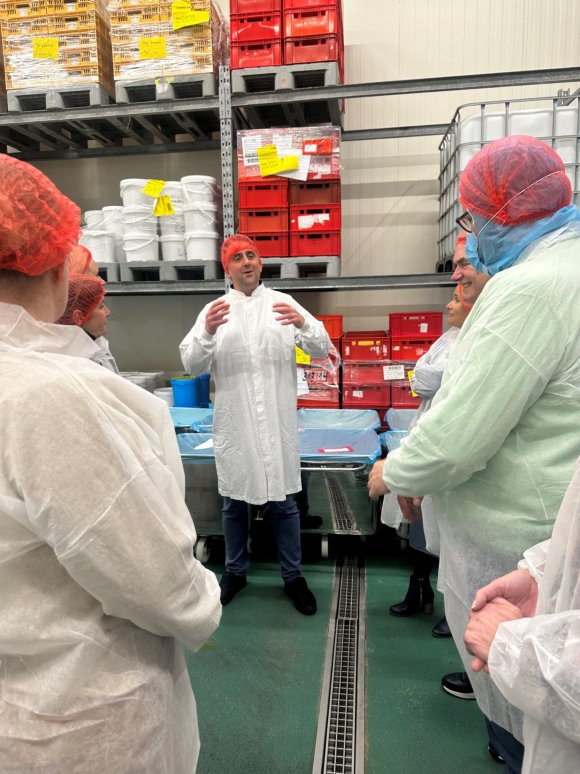 ‘Chef’ & accountmanager Jan-Hein liet ons heerlijke spreads en dips proeven. Waarna Roberto en productiemanager Simon ons rondleidden door imposante productiehallen met grote blinkende apparaten, langs controle- en verpakkingslijnen. Natuurlijk pas nadat we ons heel hygiënisch hadden aangekleed en handen en schoenen hadden ontsmet. Veiligheid en hygiëne voorop!