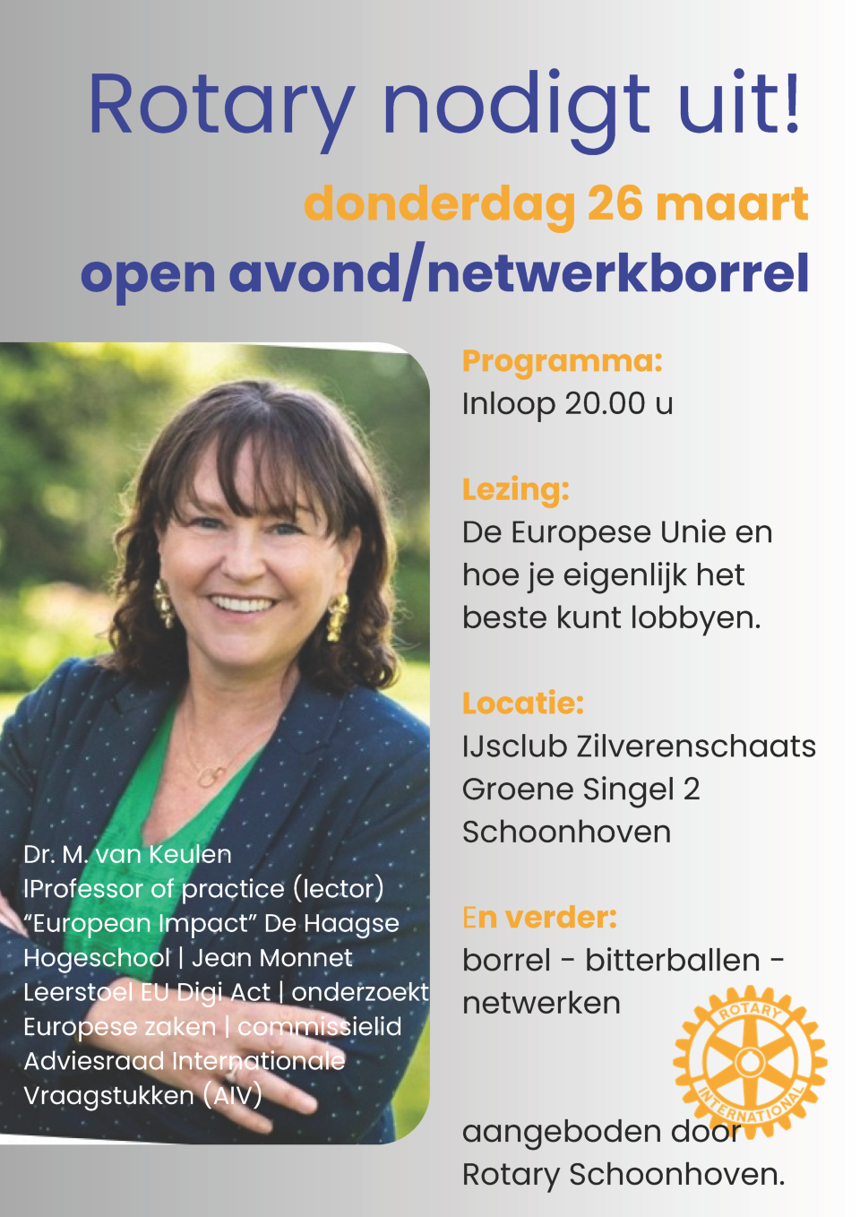 Donderdagavond 26 maart ontvangen wij in Schoonhoven een bijzondere spreker: Dr. M. van Keulen. Graag nodigen wij belangstellenden uit om hierbij aanwezig te zijn. U bent van harte welkom om haar inspirerende verhaal te horen en daarna met elkaar in gesprek te gaan bij de borrel.