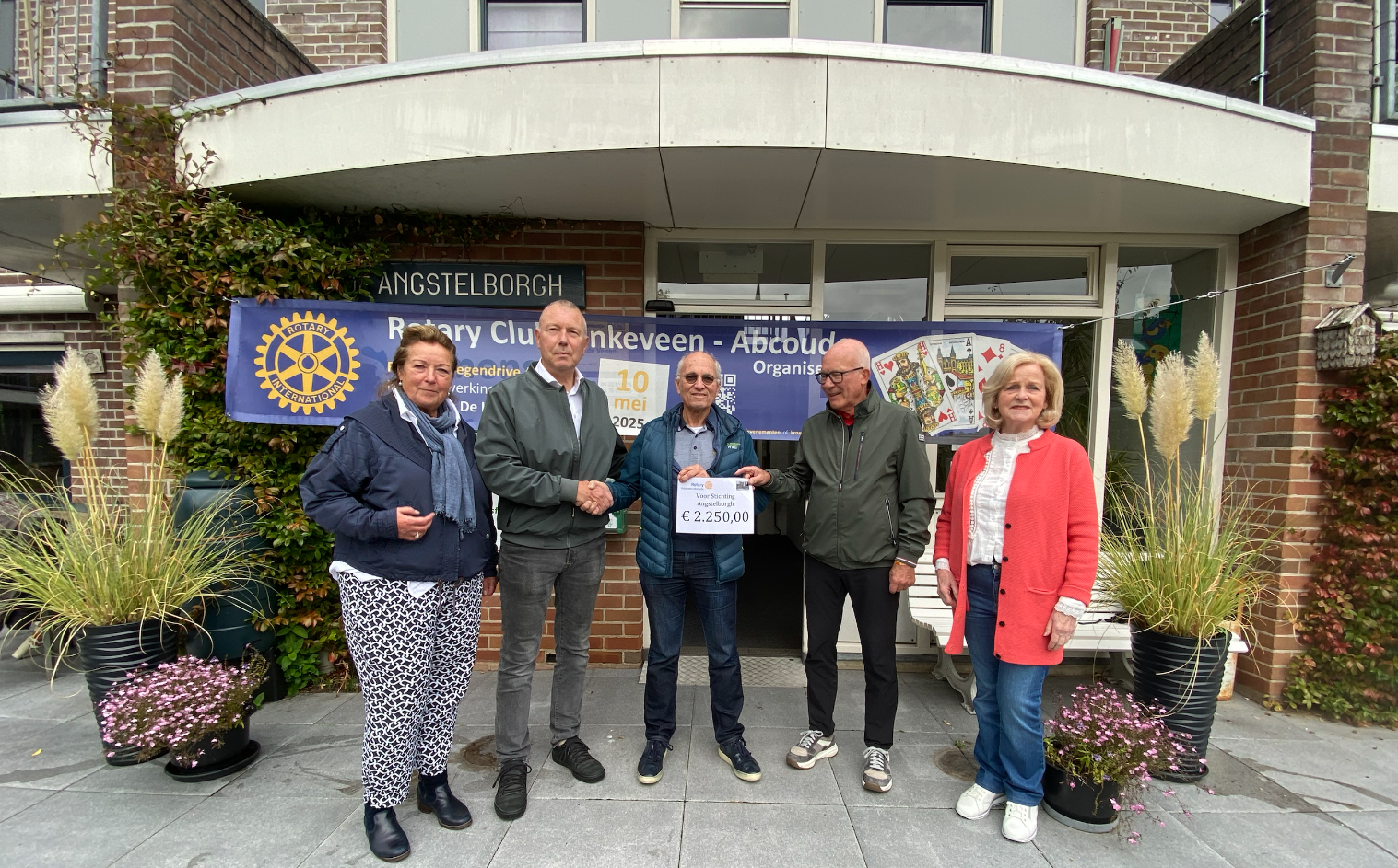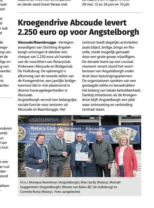 Woensdag 8 oktober jl. werd een cheque overhandigd aan vertegenwoordigers van de Stichting Angstelborgh door de voorzitters van Rotaryclub Vinkeveen-Abcoude en Bridgeclub “De Hulksbrug”. Angstelborgh, dat recent dreigde te worden wegbezuinigd, is hèt centrum waar senioren uit Abcoude en Baambrugge elkaar ontmoeten. Dagelijks worden daar leuke activiteiten georganiseerd, zoals bijvoorbeeld biljart, bridge, bingo, filosofieclub. Dit alles is mogelijk door de inzet van veel enthousiaste vrijwilligers.