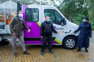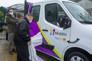 Voorburg | De cliënten van Middin in het leerwerktraject Groen, kunnen vanaf vandaag met hun nieuwe hoveniersbus naar hun werkplekken. In de stromende regen, is de bus onthuld door een cliënt, een werkbegeleider van Middin en met de sponsoren de Rotary Voorburg en de Tafelronde 103 Leidschendam-Voorburg.