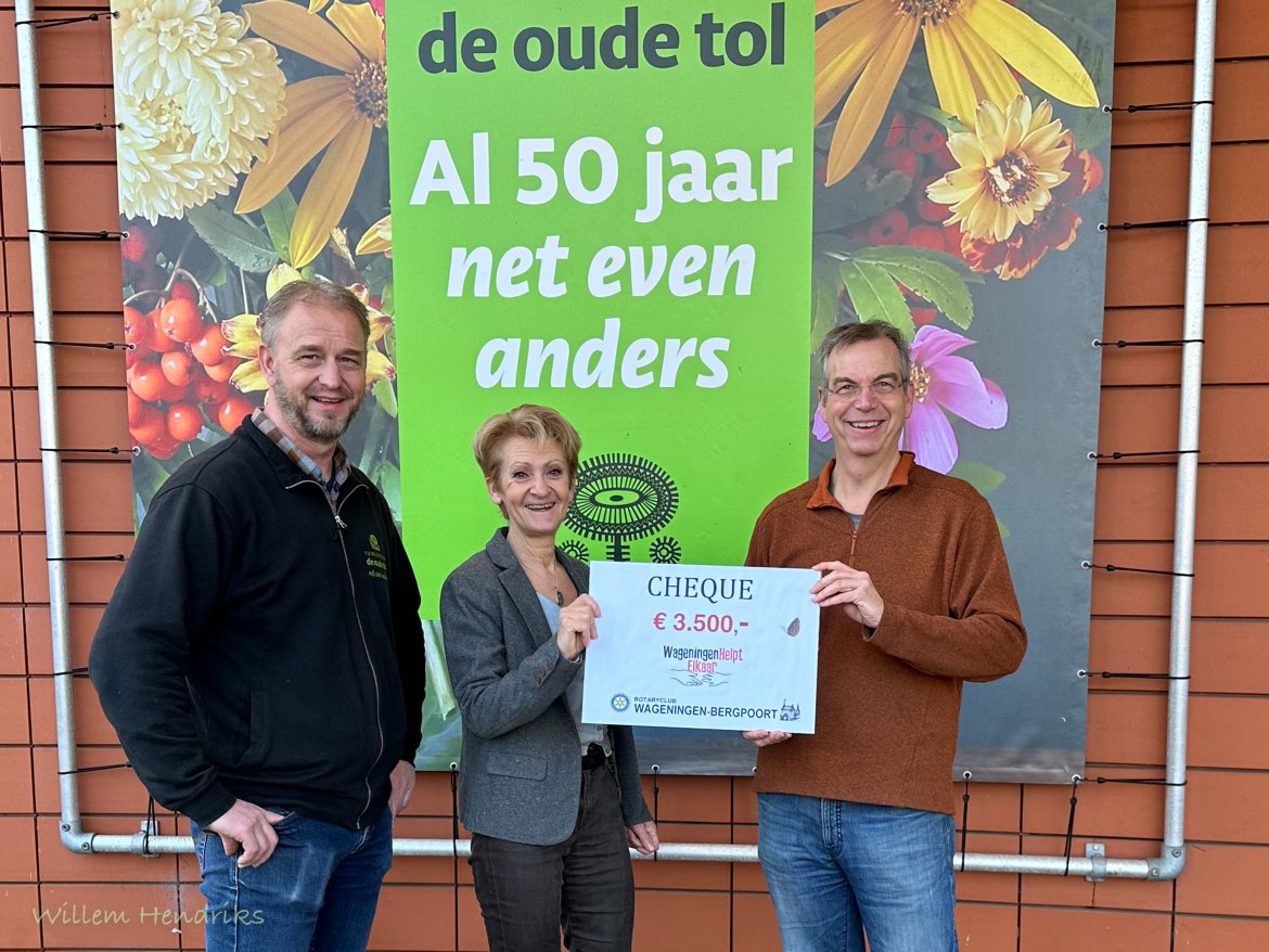Rotaryclub Wageningen Bergpoort hield eind 2022 een actie in tuincentrum De Oude Tol waar maar liefst 3.500 euro werd opgehaald. Het bedrag werd geschonken aan ‘Wageningen helpt elkaar’. Het initiatief ‘Wageningen helpt elkaar’ van de gezamenlijke Wageningse serviceclubs en Welsaam (het samenwerkingsverband van maatschappelijke organisaties) loopt volop.