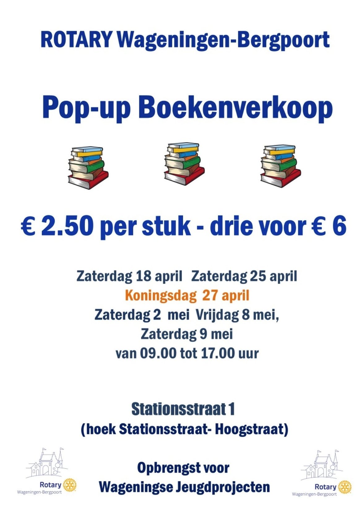 Dit jaar openen we wederom een pop-up boekenwinkel en wel op de hoek van de Statsionsstraat en de Hoogstraat. Op de onderstaande data verkoipen we uit onze voorraad van meer dan 10.000 boeken, platen en Cd's. Kom lang en sla uw slag, er is voor ieder wat wils. De prijs van de boeken is 2,50 euro per stuk en 3 voor 6 euro. We zien u graag in de winkel! We zijn open op zaterdag 18 en 25 April , koningsdag /maandag 27 april en op 2, 8 en 9 mei.